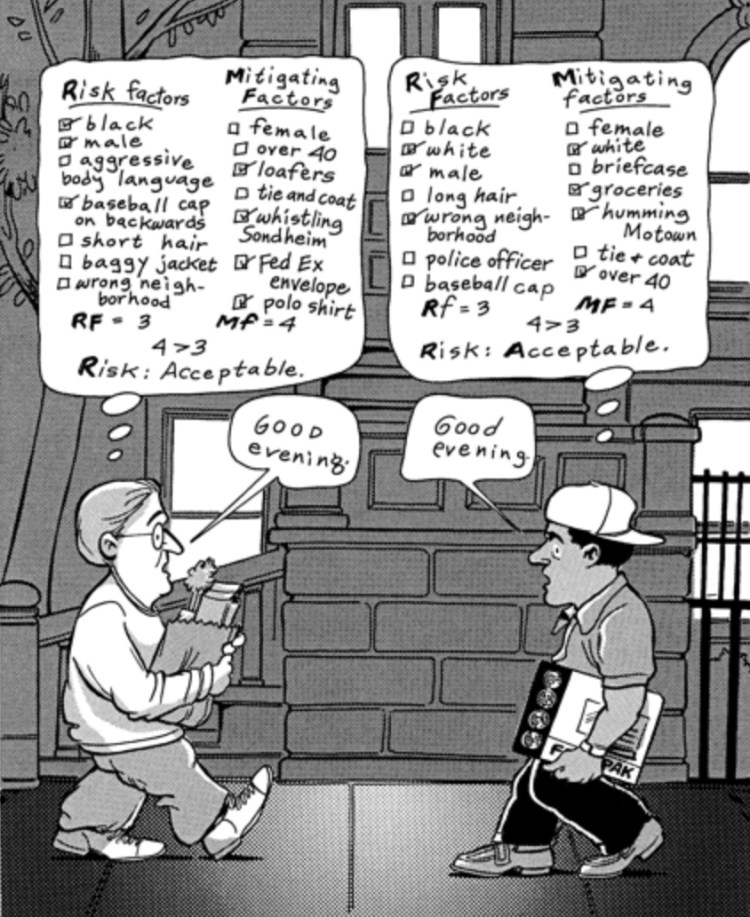 For example, in the cartoon, being black equates to risk, and location has an effect on risk levels. In both character’s heads, being female, being over 40, and looking professional are all mitigating factors — meaning they decrease the perceived risk .