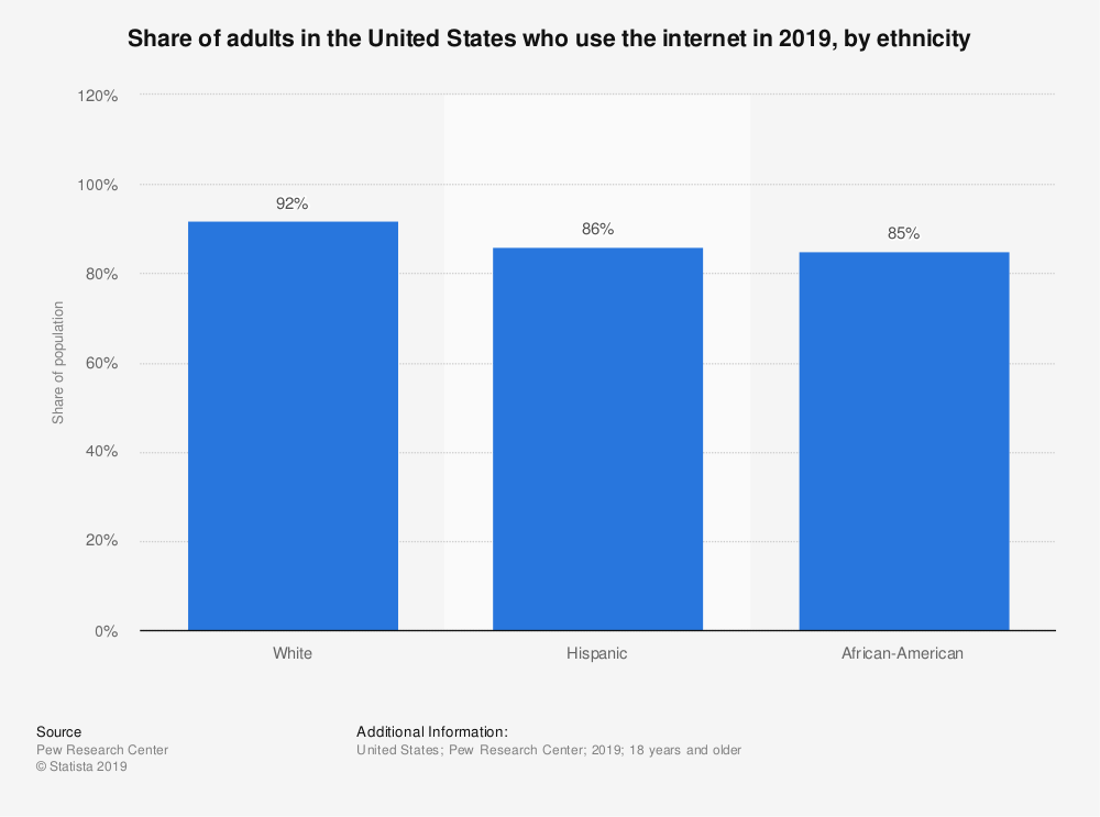 The Pew Research Center suggests that a person’s likelihood of using the internet can be determined by age, location, education, income, and ethnicity. It was found that roughly 3 in 10 adults with less than a high school degree do not use the Internet. Senior citizens and citizens living in rural areas are also less likely to use the internet. While 92% of white people use the internet, that number drops to only 85% for Black people, and 86% for Latinos.